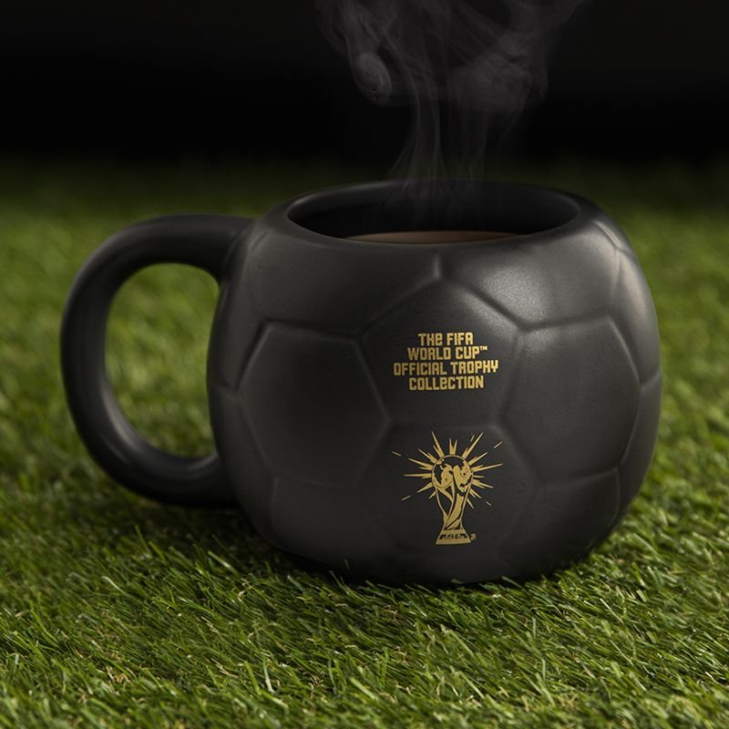 À l’avant du mug se trouve la reproduction officielle de la Coupe du Monde FIFA, imprimée en or. Cette coupe emblématique est l’un des trophées sportifs les plus reconnus, symbolisant la force et la pureté de l’esprit de compétition.